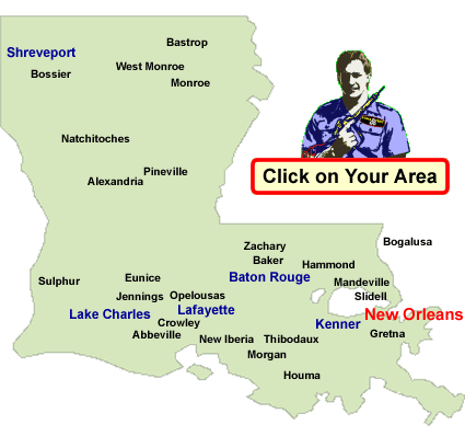 | Find out about termites, termite control and pest control in the cities and towns of LOUISIANA including - Abbeville - Alexandria - Baker - Bastrop - Baton Rouge - Bogalusa - Bossier City - Crowley - Eunice - Gretna - Hammond - Houma - Jennings - Kenner - Lafayette - Lake Charles - Mandeville - Minden - Monroe - Morgan City - Natchitoches - New Iberia - New Orleans - Opelousas - Pineville - Ruston - Shreveport - Slidell - Sulphur - Thibodaux - West Monroe - Westwego - Zachary and other LOUISIANA towns. |